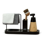 Setet består av hållare, tvåldispenser, diskborste, diskhandduk och trasa.