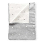 Babytæppet er vendbart med to forskellige sider: hhv. grå med råhvide prikker og råhvid med grå prikker.