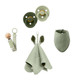 Denne bundle består af en Kangaroo nusseklud og en savlesmæk i økologisk, blød muslinbomuld. Hertil kommer 2 stk. BIBS Rund Colour sutter i str. 2 - og en suttesnor.