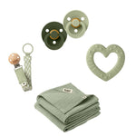 Denne bundle består af en 2-pak stofbleer i økologisk, blød muslinbomuld. Hertil kommer en bidering, 2 stk. BIBS Rund Colour sutter i str. 2 - og en suttesnor.