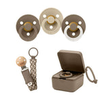 Denne bundle består af 3 stk. BIBS Rund Colour sutter i str. 2, en suttesnor og en sutteboks med plads til 3 sutter.