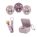 Denne bundle består af 3 stk. BIBS Rund Colour sutter i str. 2, en suttesnor og en sutteboks med plads til 3 sutter.