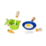 Fint sæt med køkkenudstyr i FSC certificeret træ fra BRIO. Vælg mellem 2 forskellige sæt. Gryde sæt med gulerod, suppeske, gryde og låg. Pande sæt med spejlæg, palletkniv o...