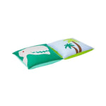 Detta kudd-set från Hoppekids är en del av universumet Dinosaur och innehåller 2 läckra kuddar. Kudd-setet består av två stora, halvfasta kuddar. De ger god komfort när det är läsdags i sängen. Den fräcka dinosaurien och de två fina palmerna pyntar fint i rummet, även när kuddarna inte används. Kuddarna är 50 x 50 x 15 cm. Serien Dinosaur från Hoppekids skickar ditt barn tillbaka till den tiden då de mäktiga dinosaurierna var kungarna. Universumet är designat i klara blåa och gröna färger, och det finns massvis med fina detaljer att upptäcka såsom exempelvis den stora ångande vulkanen. Klädseln kan tas av och tvättas vid 30 grader.