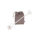 Docknappen med nappkedja med björnhuvud kommer i en tillhörande söt förvaringspåse i quiltad jersey, som finns i flera färger, här ses den i grå.