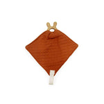 En fin bitring i trä är sydd in i dockans mysiga lilla snuttefilt.